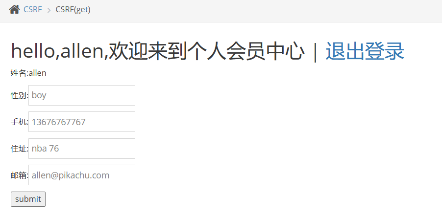 <form action="http://www.wangehacker.cn/pikachu-master/vul/csrf/csrfget/csrf_get_edit.php" method="get">
